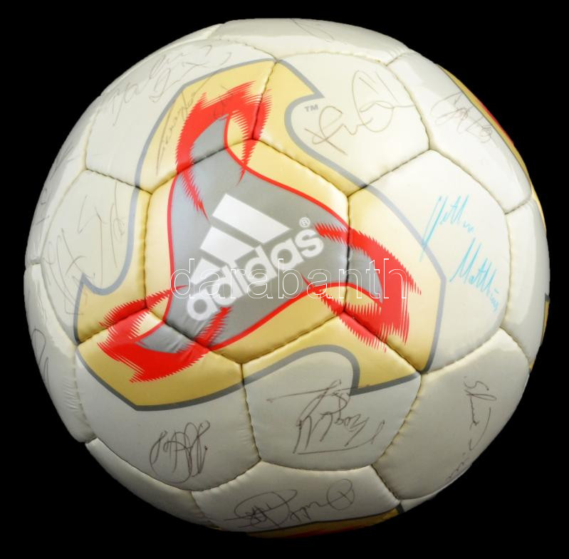 cca 2003 A magyar futball válogatott és Lothar Matthäus volt szövetségi kapitány által aláírt adidas bőrlabda, összesen: 18 aláírással