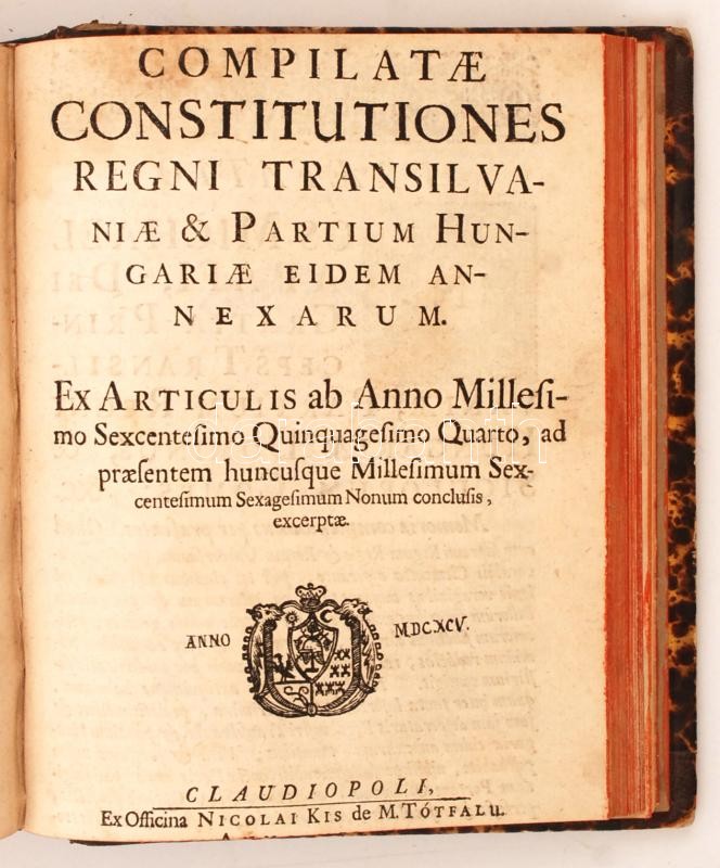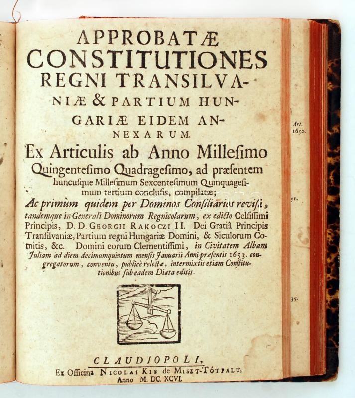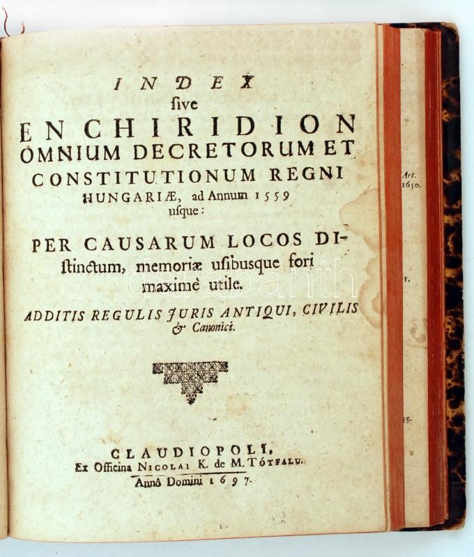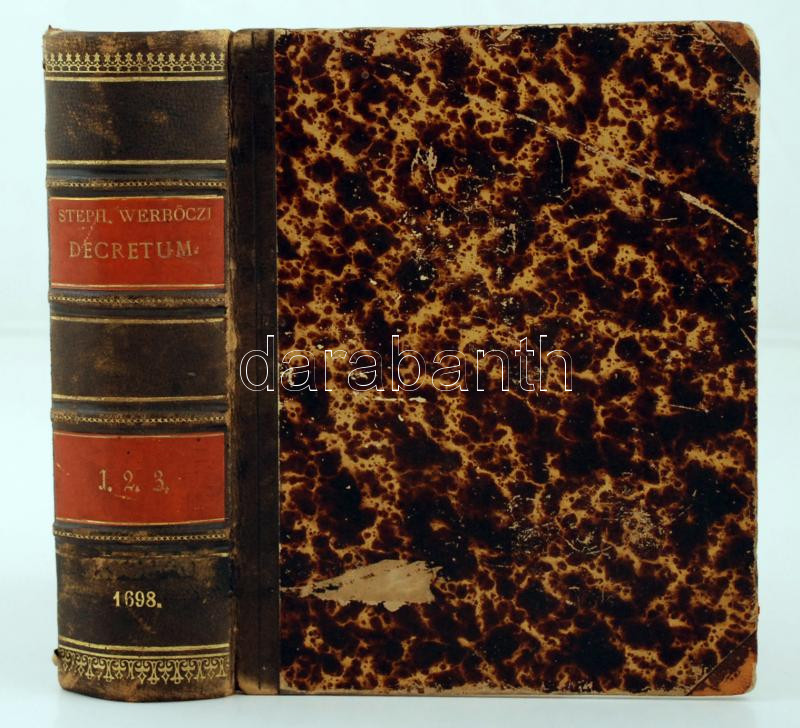 Werbőczi István: Decretum Latino-Hungaricum. Sive Tripartitum opus juris consuetudinarii.. Az az, Magyar és Erdély Országnak három részre osztott törvény könyve Kolosváratt, 1698. M. Tótfalusi Kis Miklós. (24)+44+225 [helyesen 425]+(35)p. A címlap hiányzik, valamint a 225 oldal előtt csak 22 oldal szöveg van meg. Hozzákötve: (Telegdi Miklós-Mossóczi Zakariás): Index sive enchiridion... Regni Hungariae, ad annum 1559 Claudiopoli, 1697. Ex Officina Nicolai K. de M. Tótfalu. (96)p. Teljes. A Decretum függelékeként megjelent Index 1579-ig dolgozza fel a decretumokat és a constitutiokat. Hozzákötve: Approbatae Constitutiones Regni Transilvaniae et Partium Hungariae Eidem Annexarum. Ex Articulis ab Anno Millesimo Quingentesimo Quadragesimo, ad praesentem huncusque Millesimum Sexcentesimum Quinquagesimum tertium conclusis, compilatae. Claudiopoli, 1696. Ex Officina Nicolai Kis de Miszt-Tótfalu. (6)+280+(30)p. A 44-208. oldal hiányzik. Hozzákötve: Compilatae Constitutiones Regni Transilvaniae et Partium Hungariae Eidem Annexarum. Ex Articulis ab Anno Millesimo Sexcentesimo Quinquagesimo Quarto, ad praesentem huncusque Millesimum Sexcentesimum Sexagesimum Nonum conclusis, excerptae. Claudiopoli, 1695. Ex Officina Nicolai Kis de M. Tótfalu. (4)+118+(14)p. Az utolsó oldalon lyuk. Misztótfalusi fontos feladatnak látta, hogy az erdélyi jogélet alapjait jelentő fejedelemségkori törvénygyűjteményeket hozzáférhetővé tegye, ezért jelentette meg Werbőczi már alig fellelhető Hármaskönyvének latin-magyar szövegét. Kolligátumunk együtt tartalmazza a ,,sorozat" minden elemét. XIX. századi félbőr kötésben. Lapok alul kissé szűkre vágva. RMK I. 1529, 1486....