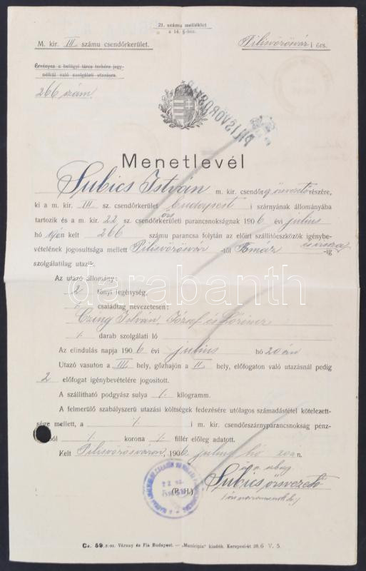 https://www.darabanth.com/en/251-Online-auction/251.0/Other-collectibles/Documents~600024/1906-Menetlevel-csendor-szamara-Pilisvorosvar-Pomaz~II1213375
