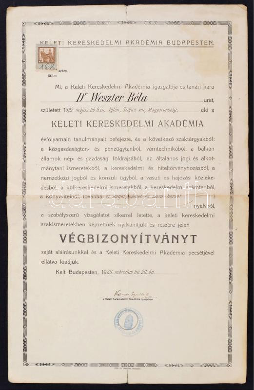 1920 Végbizonyítvány Keletei Kereskedelmi Akadémia Budapesten, okmánybélyeggel (2korona), bélyegzővel, kis szakadással, 47x30cm