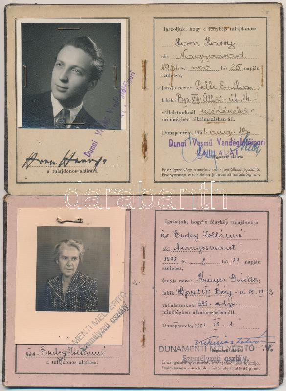 1951 Dunapentele, A Dunai Vasmű Vendéglátóipari Vállalat és a Dunamenti Mélyépítő Vállalat által kiadott fényképes igazolványok, 2 db