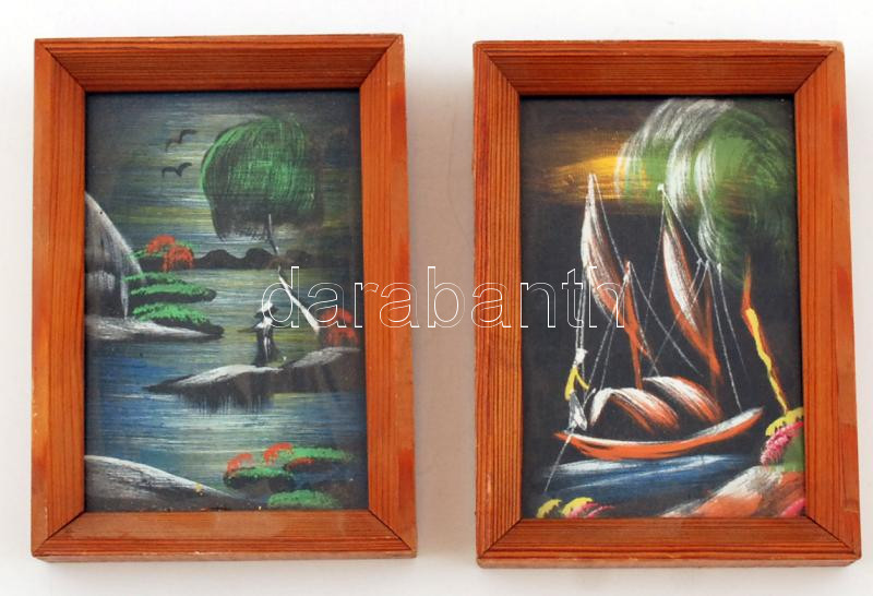 2 db festett selyemkép, üvegezett keretben, 12×8 cm (2×)