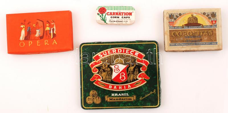 Description: 3 db régi cigarettás doboz: Opera (papír), Coronitas (papír), Suerdieck Bahia Brazil (fém) + Six carnation corn caps kisméretű fém doboz, különböző méretben