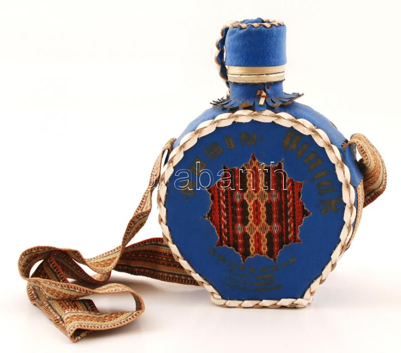 Dekoratív jugoszláv kulacs, üveg, bőr borítással, m: 16 cm