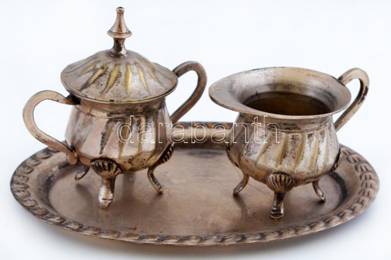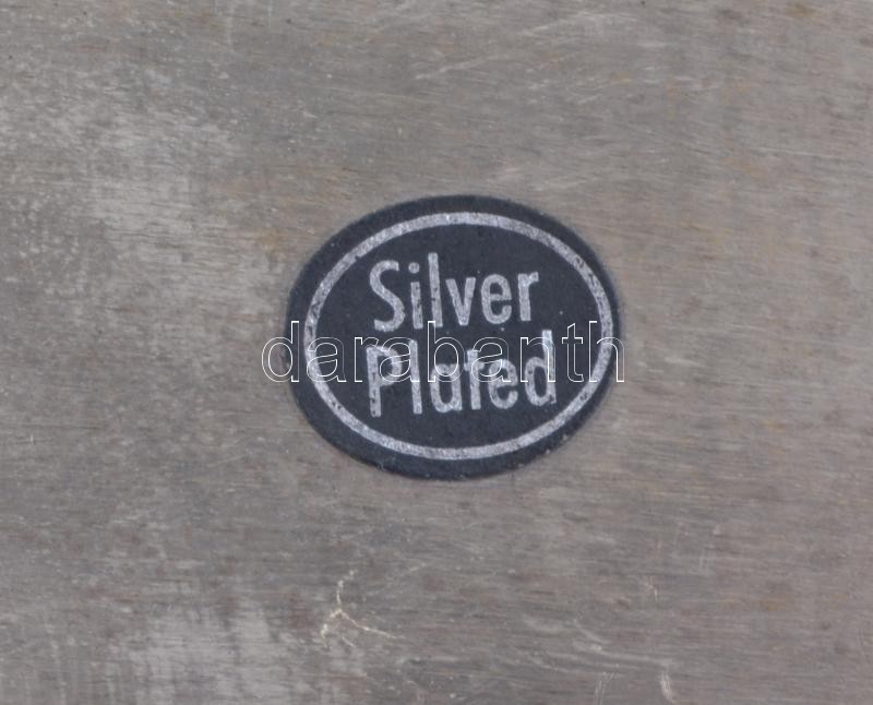 Ezüstözött fedeles fém fűszertartó, jelzett, d: 5 cm + ezüstözött fém kiöntő, jelzett, d: 5,5 cm + ezüstözött fém kistálca, jelzett, 17×12 cm