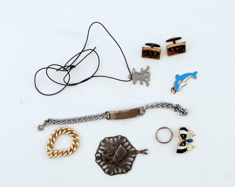 Kis bizsu tétel, benne 1 pár mandzsettagomb, 2 nyaklánc medállal, karkötő, kis gyűrű, pillangó alakú bross