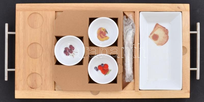Reggeliző szett: fa tálca fém fogantyúval, porcelán tálkákkal, kiskanalakkal, eredeti dobozában