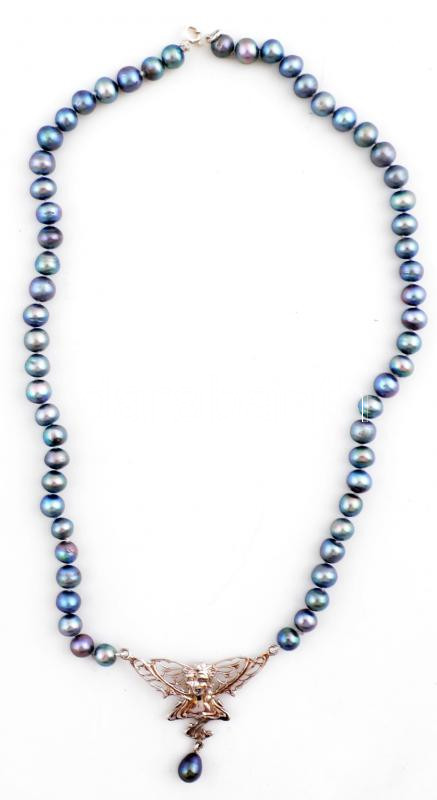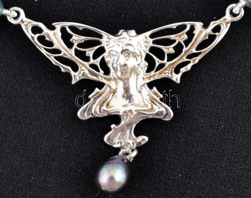 Tenyésztett gyöngy nyaklánc női fejet ábrázoló medállal, h: 46 cm