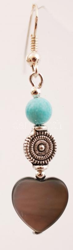 Türkiz-kagyló elemekkel díszített ékszerszett, mutatós fülbevalóval és selyemzsinóron függő szív alakú medállal
