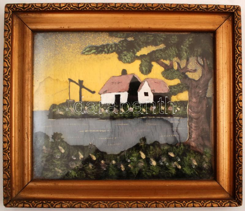 Antik fa keret, selyem képpel, belső: 21×25 cm, külső: 27×31 cm