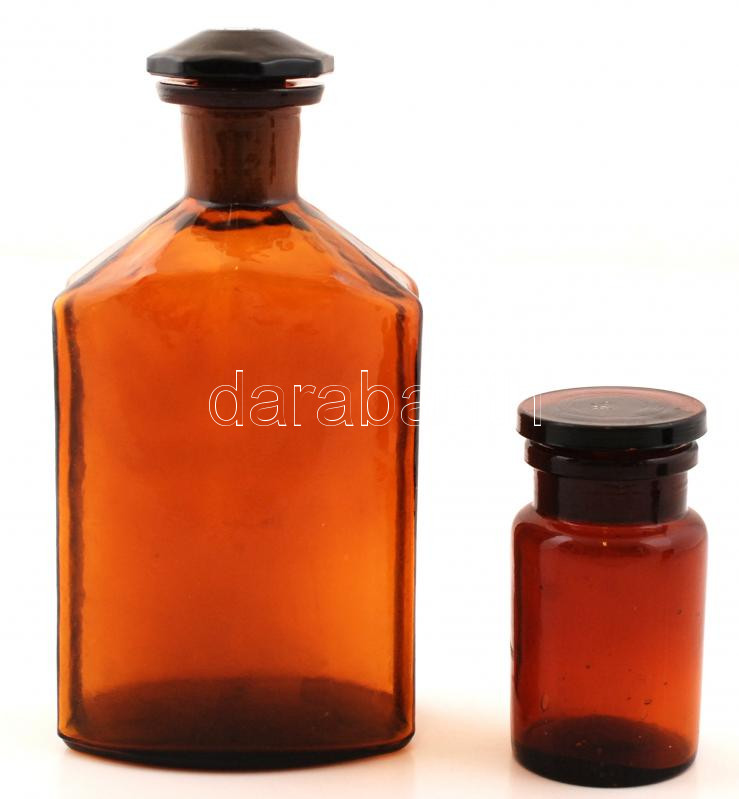 2 db barna orvosi üveg, dugóval, egyiken csorbával, m: 11 és 20,5 cm