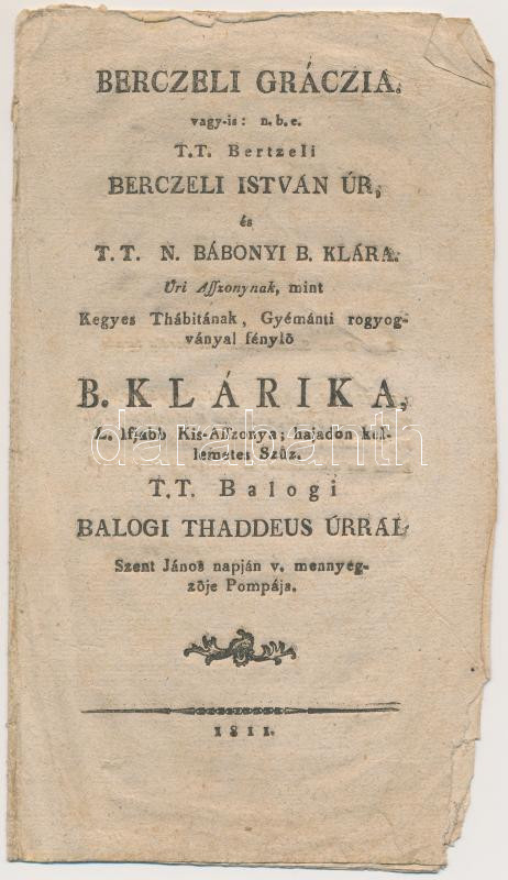 1811 Berczeli gráczia, vagyis ... B. Klárika .. tekintetes balogi Balogi Thadeus úrral ... való menyegzője pompája, nyomtatott alkalmi vers, 8 p.
