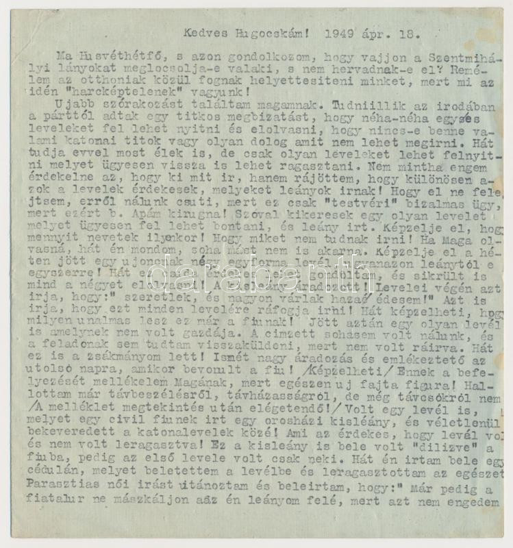 1949 Öreg katona magánlevele, amelyben beszámol titkos pártmegbiztatásáról, ill. egyéb eseményekről, 4 gépelt oldal
