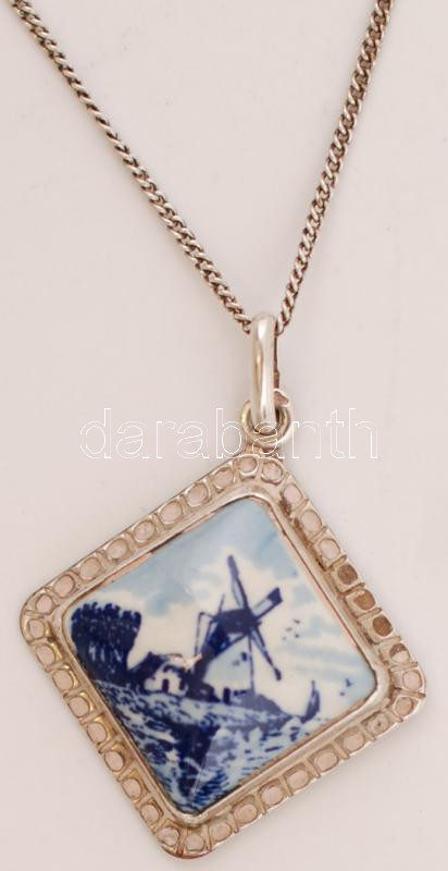 Szélmalmot ábrázoló porcelánbetéttel díszített ezüst(Ag) medál, láncon...