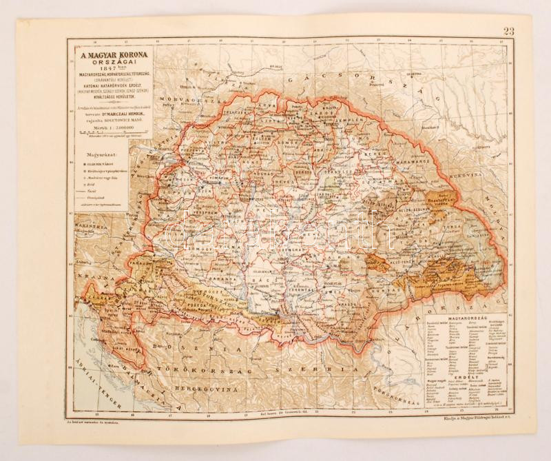 Description: A Magyar korona országai 1847-ben, Magyarország, Horvátország, Tótország, katonai határőrvidék Erdély, kiváltságos kerületek térképe dr. Marczali Henrik, Kogutowicz Manó, 31x38cm