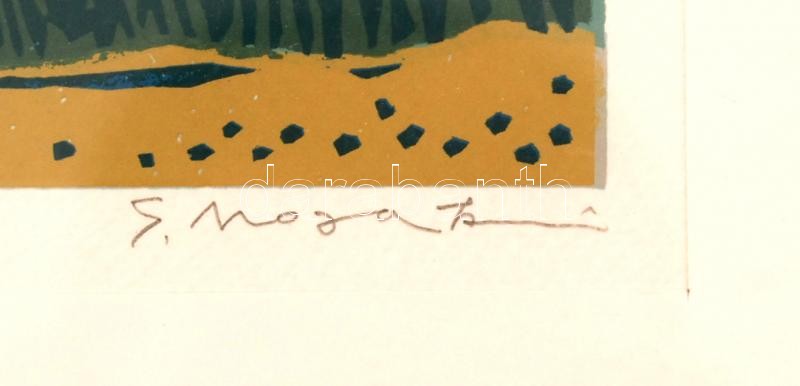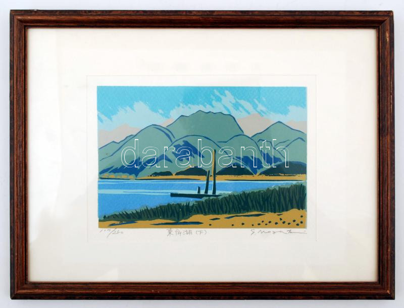 Mosaki jelzéssel: Távol-keleti tájkép, színes művésznyomat, paszpartub...