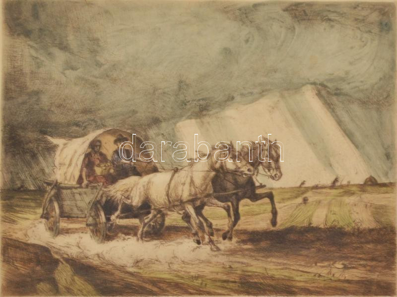 Udvary Pál (1900-1987): Hazafelé, színezett rézkarc, papír, üvegezett ...