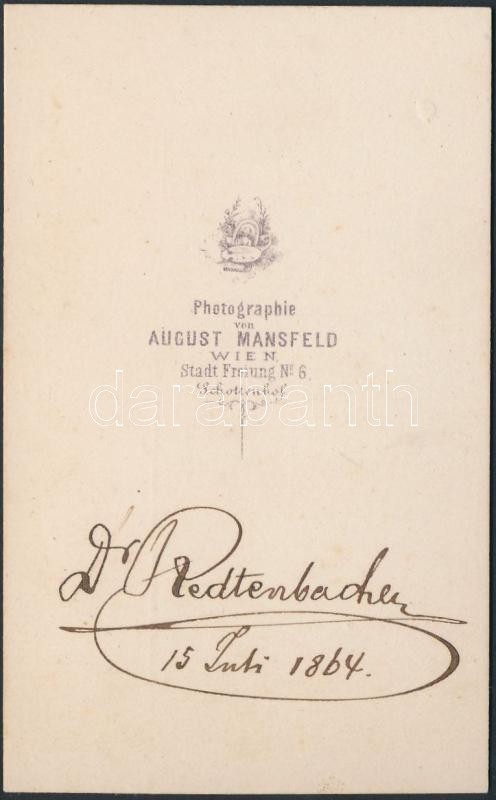 1864 Keményhátú kabinetfotó "dr. Redtenbacher" felirattal, August Mansfeld bécsi műterméből, 10x6cm