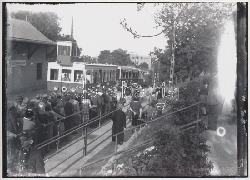 Description: cca 1925 Budapest, Fogaskerekű a Széchényi-hegyi állomáson, a vonat tetején pályafigyelő fülke, korabeli negatívról készült mai modern nagyítás, 13x18 cm