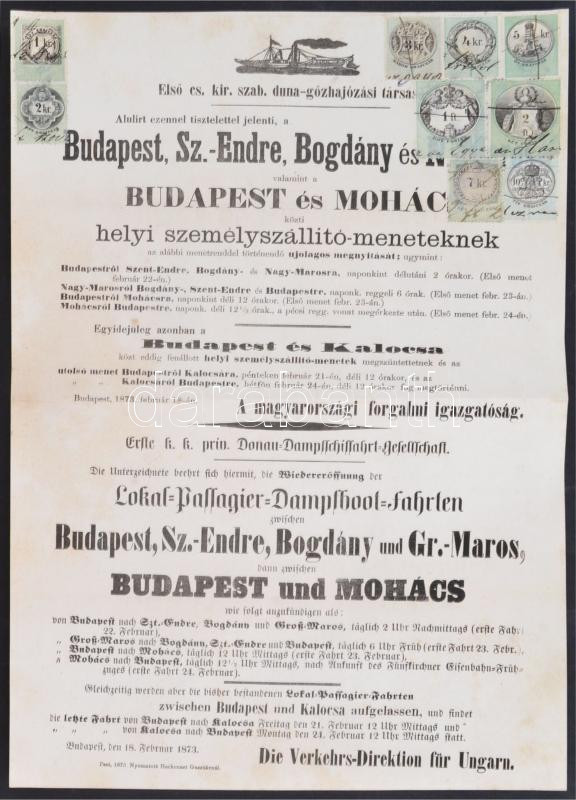 Description: 1873 Az Első cs. kir. szab. Duna-gőzhajózási Társaság helyi szemályszállító menetek megújítását kihirdető rendelete. Ráragasztott okmánybélyegekkel / Order of the DDSG for renewing schedules 28x40 cm