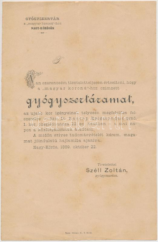 1889 Nagykőrös Magyar Korona gyógyszertár reklámnyomtatvány és fejléce...