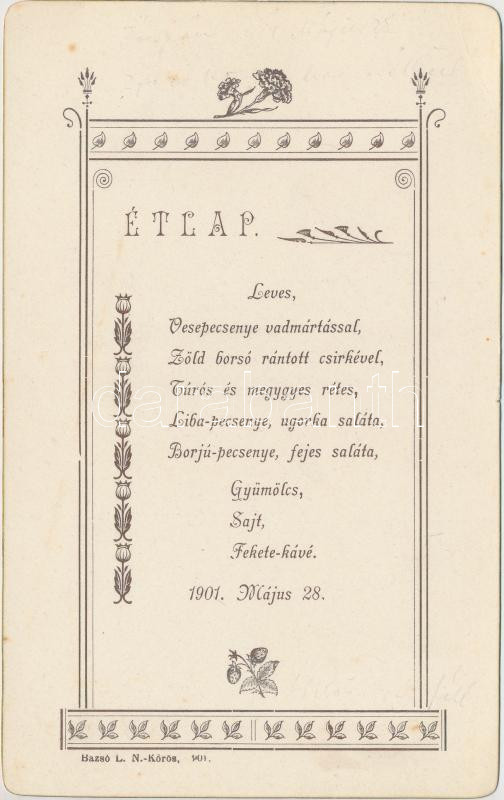 1901 Nagykőrös Fekete Sas étterem menükártya