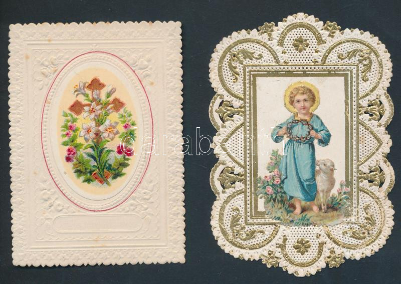 cca 1900-30 Csipkésszélű szentképek, 2db, cca 9x6cm