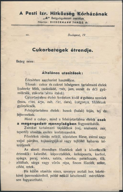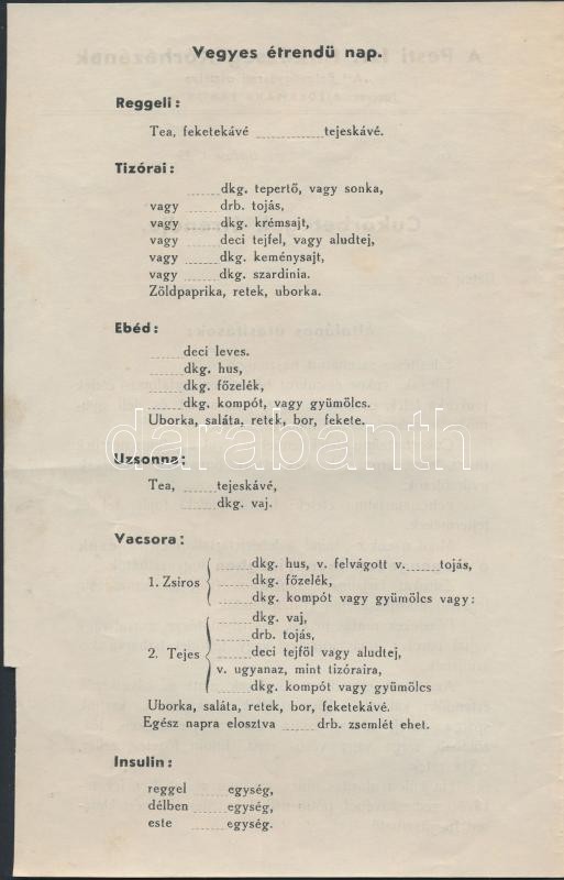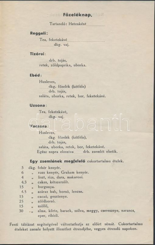 cca 1930 A Pesti Izraelita Hitközség Kórházának Belgyógyászati osztálya által kiadott, kitöltetlen cukorbeteg étrend