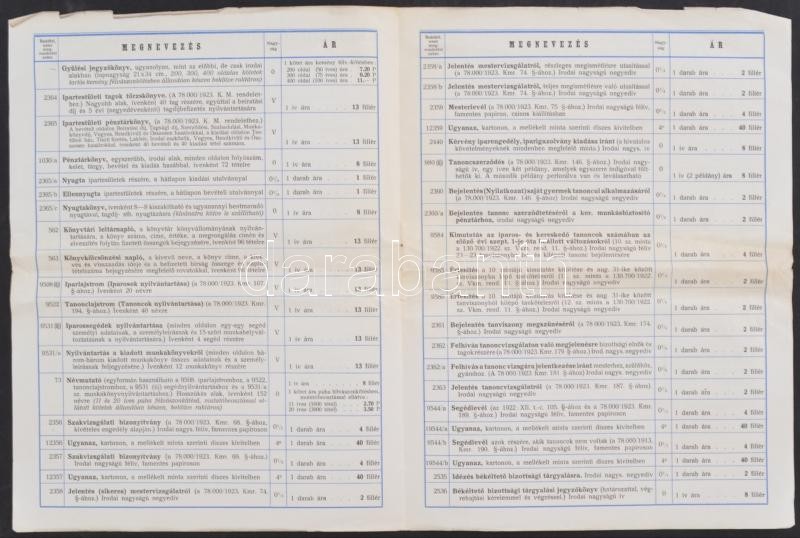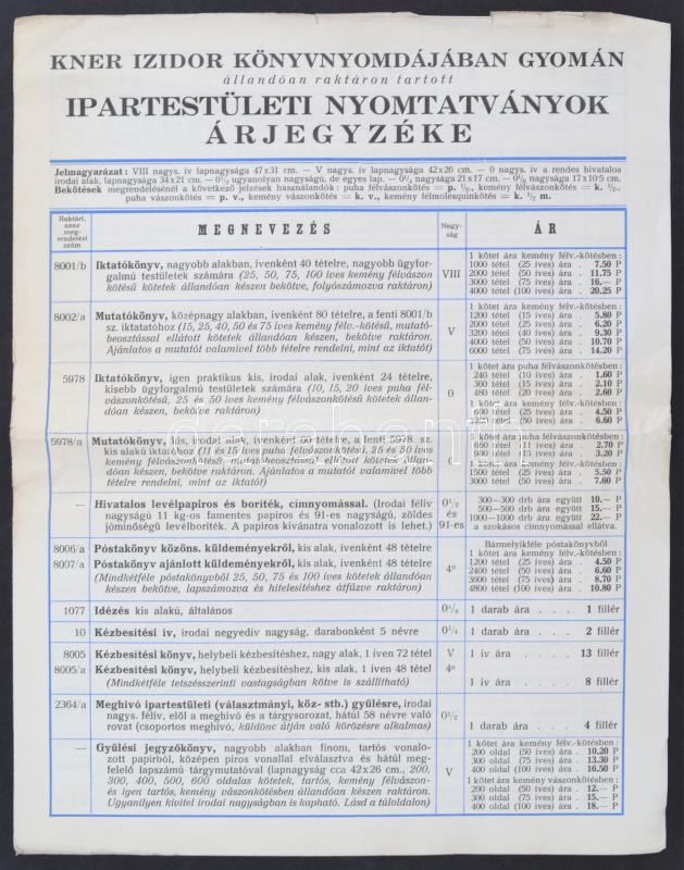 cca 1932-40 Kner Izidor Ipartestületi nyomtatványok árjegyzéke, kihajt...