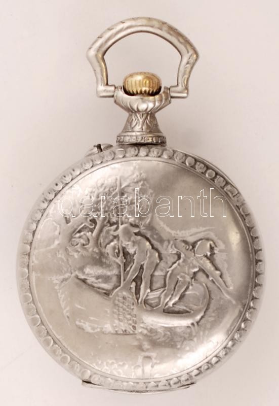 Porcelán számlapos fém tokos zsebóra, hátlapján életképes jelenettel, ...