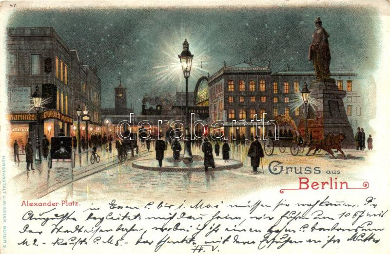 Berlin, Alexander Platz, Taxameter / square, shops, night, Kunstanstalt J. Miesler 47. litho