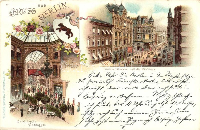Berlin, Cafe Keck-Passage, Friedrichstrasse / cafe interior, street, Kunstanstalt J. Miesler 13. floral, litho