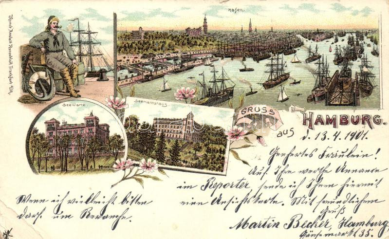 Hamburg, Seewarte, Hafen, Seemannshaus / port, sailor, Kunstanstalt Rosenblatt floral litho (EB)