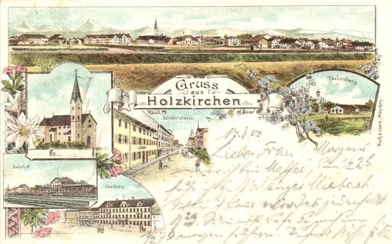 Holzkirchen, Bahnhof, Bahnhofstrasse, Taubenberg, Oberbrau / railway station, street, Moch & Stern's floral, litho (EK)