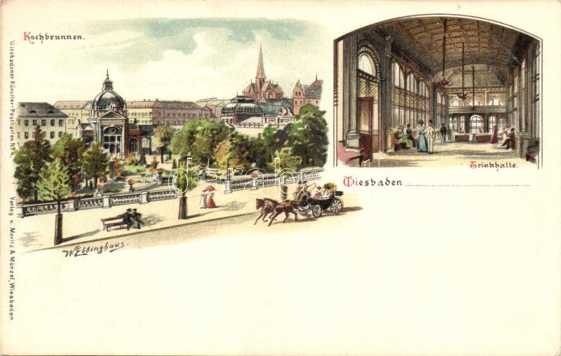 Wiesbaden, Kochbrunnen, Trinkhalle / fountain, drinking hall, Moritz & Münzel's Wiesbadener Künstler-Postkarten No. 4. litho s: W. Essinghaus