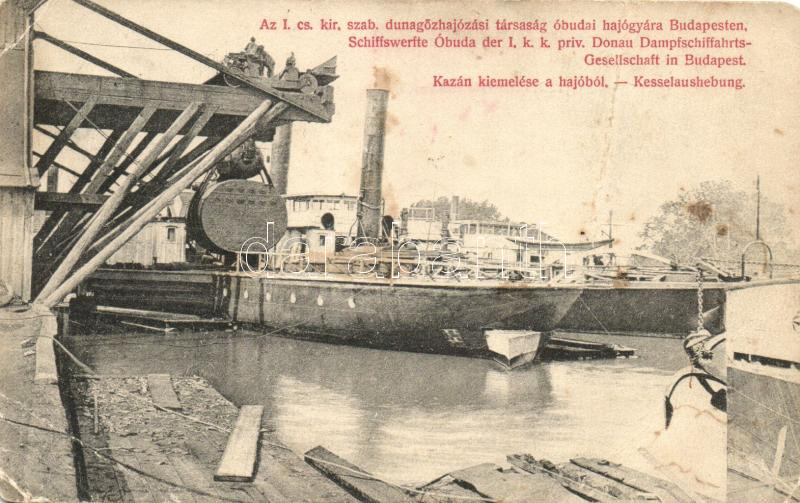 Budapest III. Óbuda, az Első Császári és Királyi Szabadalmazott Dunagőzhajózási Társaság óbudai hajógyára, Kazán kiemelése a hajóból (fa)