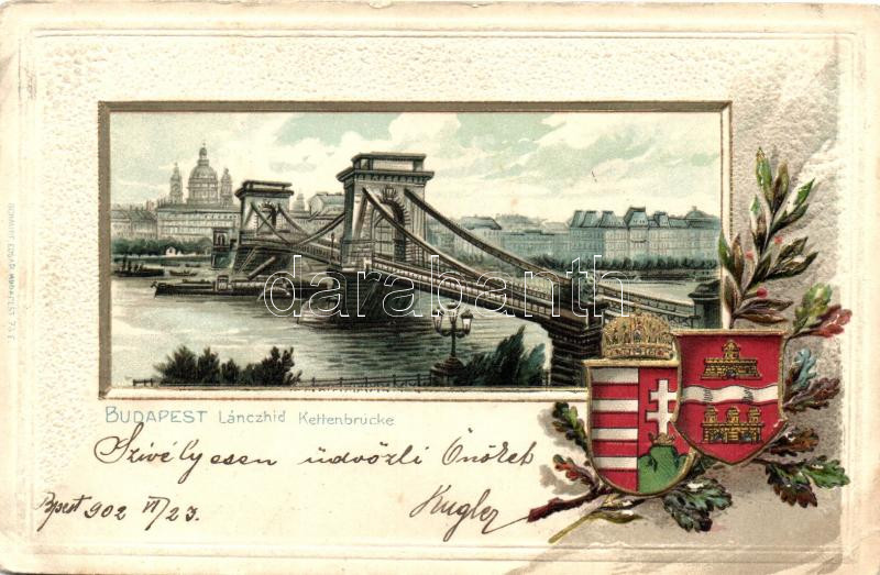 Budapest, Lánchíd, Bazilika, Magyarország és Budapest címerei, litho, floral Emb. (tűnyom / pinhole)