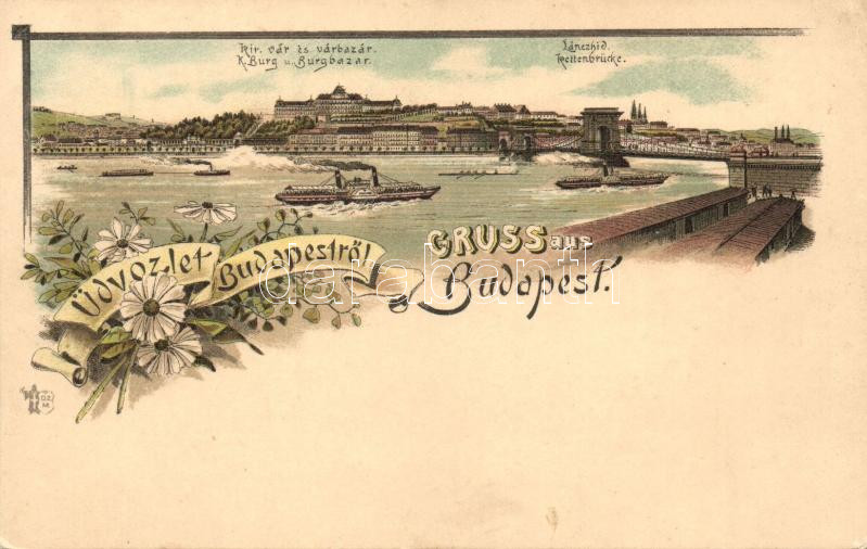 Budapest, Lánchíd, a Királyi vár és a várbazár, gőzhajó, litho, floral...