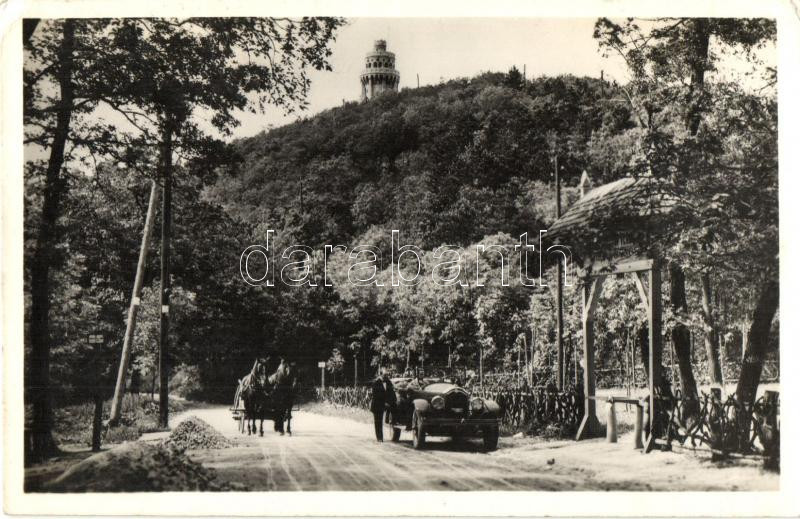 Budapest XII. Svábhegy, kilátótorony a Jánoshegyen, lovakocsi, automob...