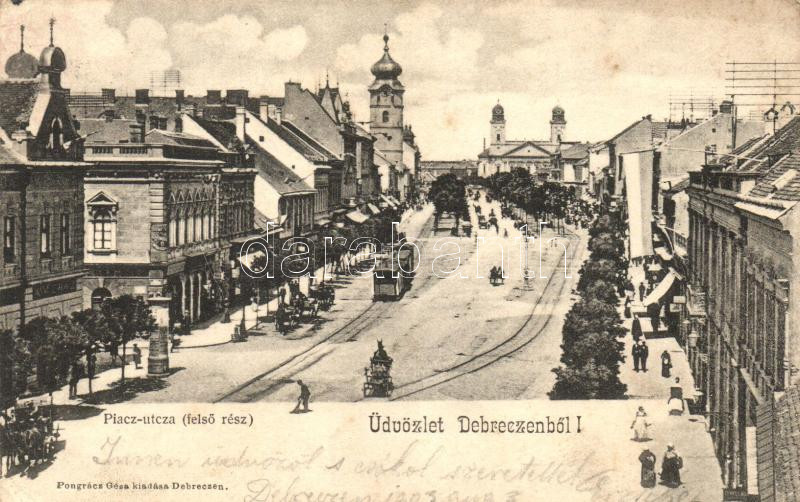 Debrecen, Piac utca, villamos, lovaskocsi, kávéház (fa)
