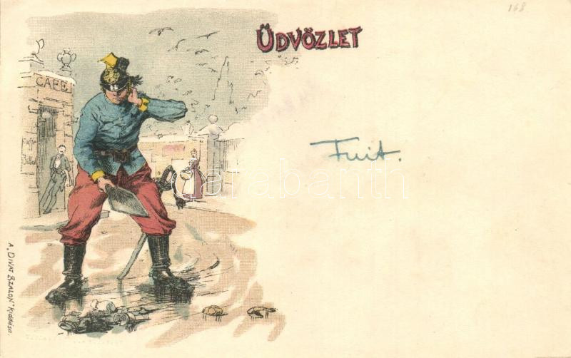 1898 Magyar honvéd huszár; Üdvözlet, a Divat Szalon kiadása / Hungarian hussar 'Grüss aus...' litho