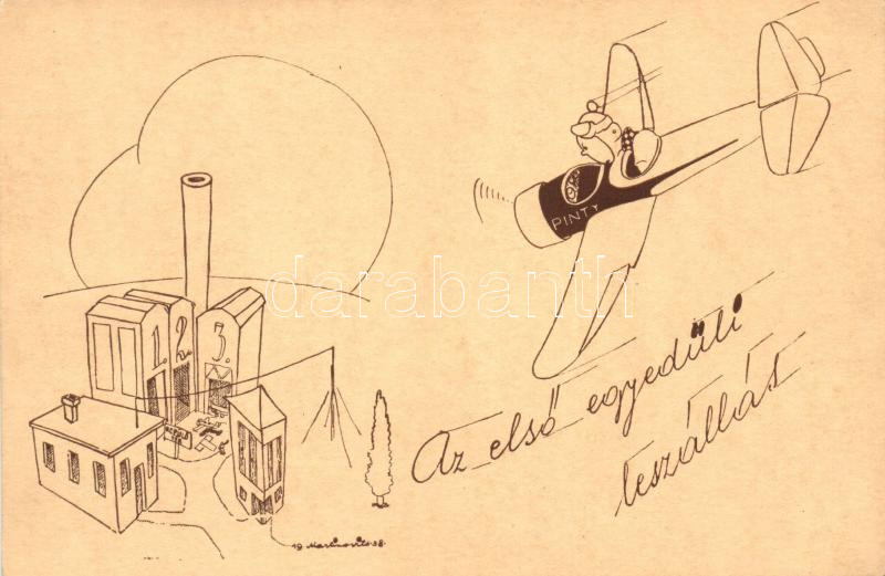 'Az első egyedüli leszállás' Humoros magyar légierős grafikai képeslap / WWII-era Hungarian airforce humorous postcard s: Martinovits