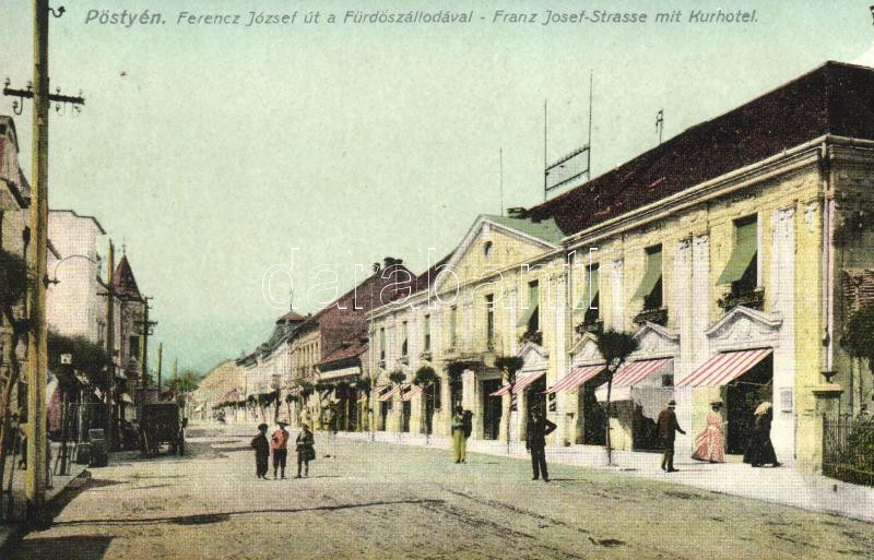 Pöstyén, Piestany; Ferenc József út a Fürdőszállóval / street, spa hotel