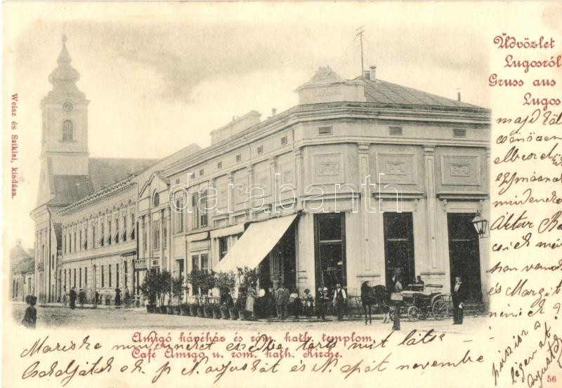 Lugos, Lugoj; Amigó kávéház és Római katolikus templom, kiadja Weisz é...