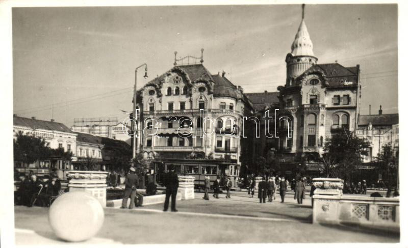 Nagyvárad, Oradea; Fekete Sas szálloda, villamos, Drogéria / hotel, tr...