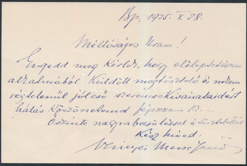 1925 Szinyei Merse Jenő (1888-1957) miniszter, politikus kézzel írt, a...