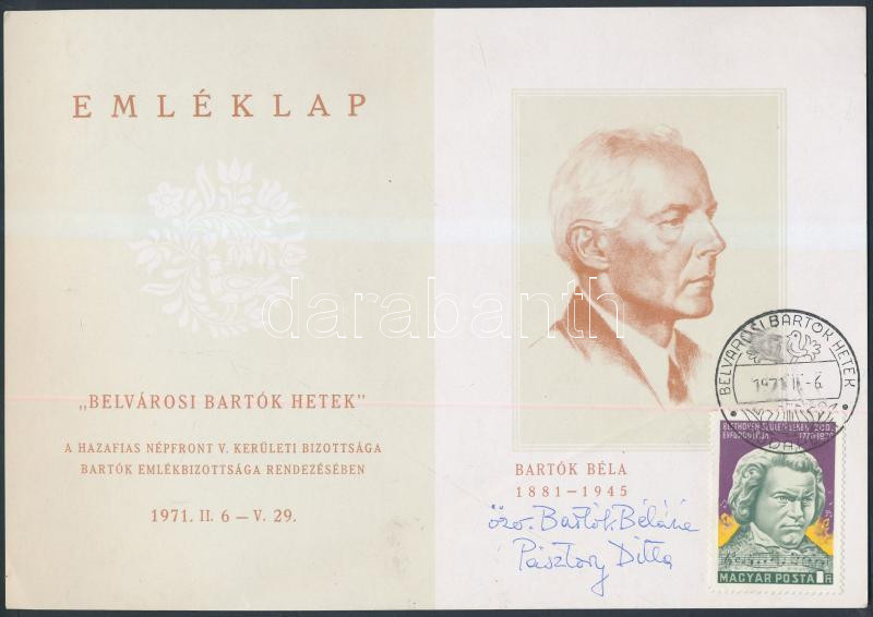 1971 Bartók emléklap, rajta a zeneszerző feleségének, Bartók Béláné Pásztory Dittának saját kezű aláírásával