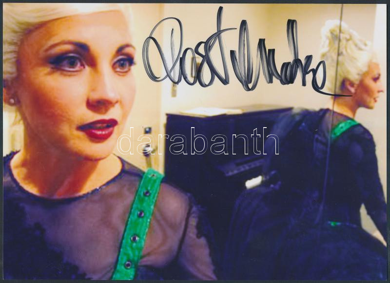 Description: Rost Andrea (1962-) Kossuth- és Liszt Ferenc-díjas magyar operaénekes (szoprán), érdemes művész saját kezű aláírása egy a művésznőt ábrázoló fotón, 15x21cm