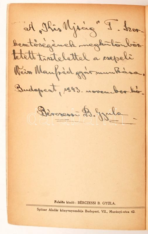 Bérczessi B. Gyula: Ha szél fú a hegyek felől. Versek. Bp., 1943, szer... https://www.darabanth.com/en/252-Online-auction/252.0/Other-collectibles/Books-Other-rarities~800034/Berczessi-B-Gyula-Ha-szel-fu-a-hegyek-felol-Versek-Bp-1943-szerzoi-A-szerzo-ajanlasC3~II1220614