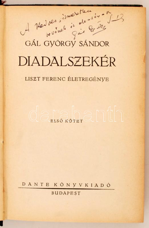 Gál György Sándor: Diadalszekér I. Bp., 1936, Dante. Aranyozott kiadói félvászonkötésben, a borítótáblák cseréltek. Dedikált példány!